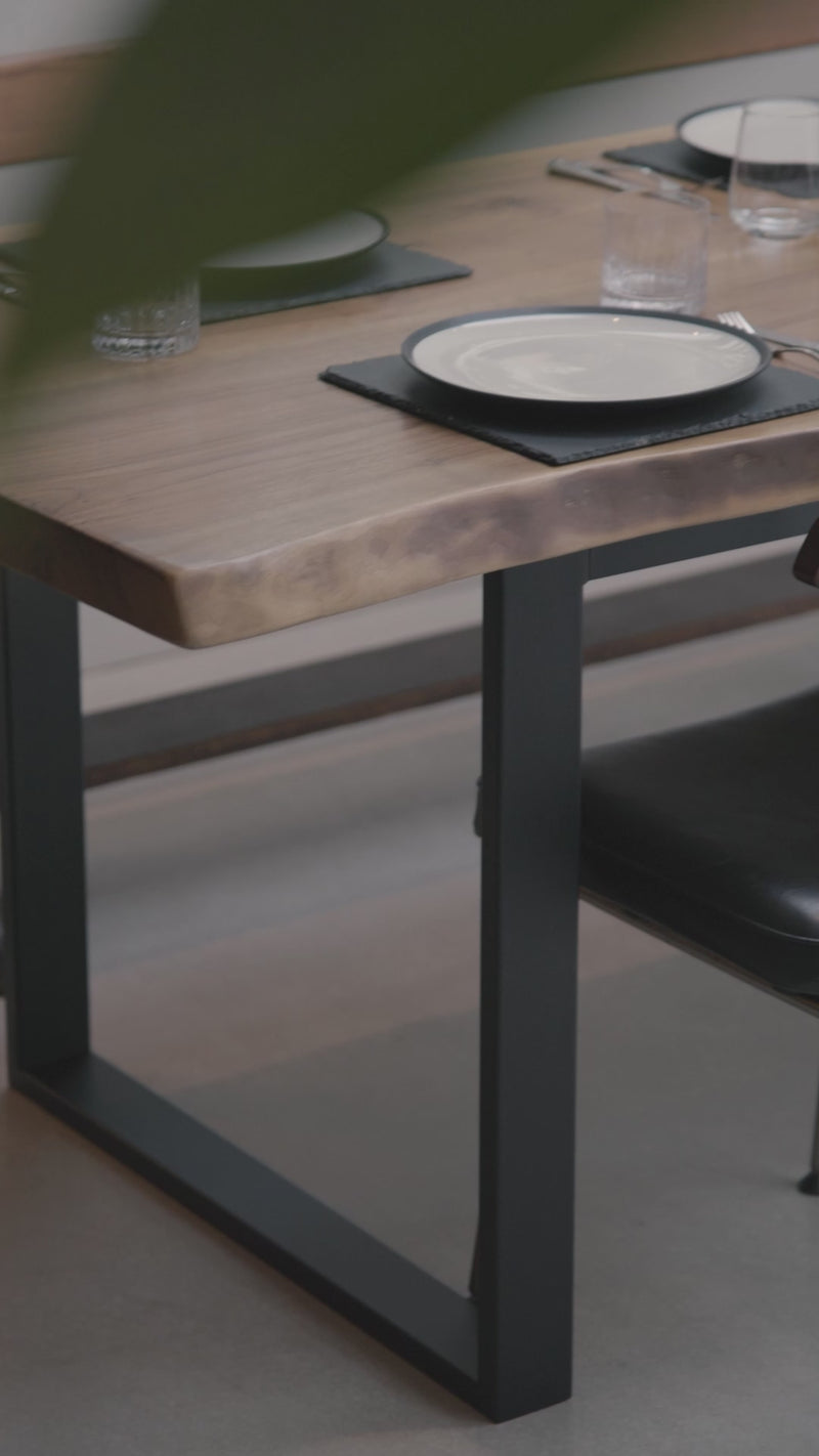 Create a stunning and modern look in your dining space with this solid walnut live-edge dining table. Featuring a unique natural edge, this table is crafted with black sturdy frame legs for superior stability and years of use. Enjoy a warm and inviting atmosphere with this timeless design.